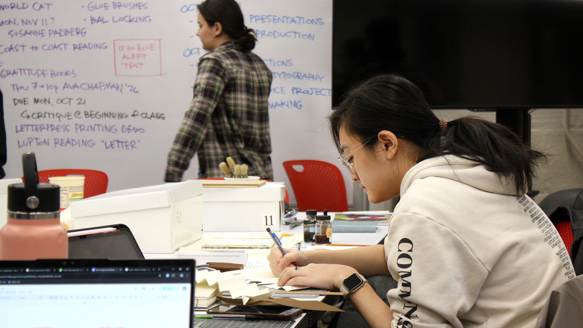 Katherine Ruffin, director of the book studies program, said she’s seen her book arts students go on to become everything from cybersecurity experts to midwives. “It’s a spirit, it’s a way of doing things. It’s more than just a place,” she said of the lab. Ruffin cultivates a warm environment in the lab, supporting students and alums, maintaining the lab, teaching classes, and bringing the tight-knit network together. Siddall said, “The mentorship and active relationship-building that Katherine facilitates is a huge, huge part of how I have made my way down the path I am on. … [W]hat really spoke to me was the physical connection between knowing and making, and the relationships that derive from a shared physical experience with others.”