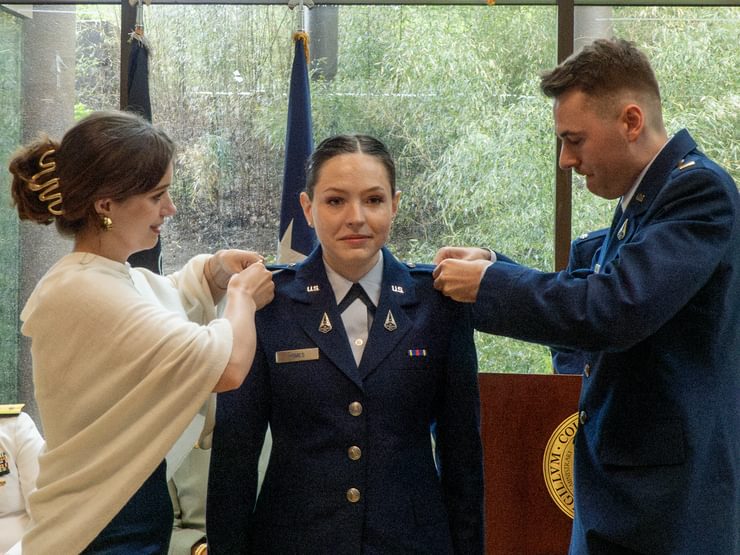 Before the pinning of ranks—assisted by Homes’s best friend, Sarah Pottle ’25, and her fiancé, fellow USSF 2d Lt. Cameron Morgan—Acquavella gave Homes some advice: “Never forget that relationships matter. You have a ton of relationships from your time here at Wellesley that will carry long into the future. And in terms of serving your country, we all understand that relationships build readiness.”
